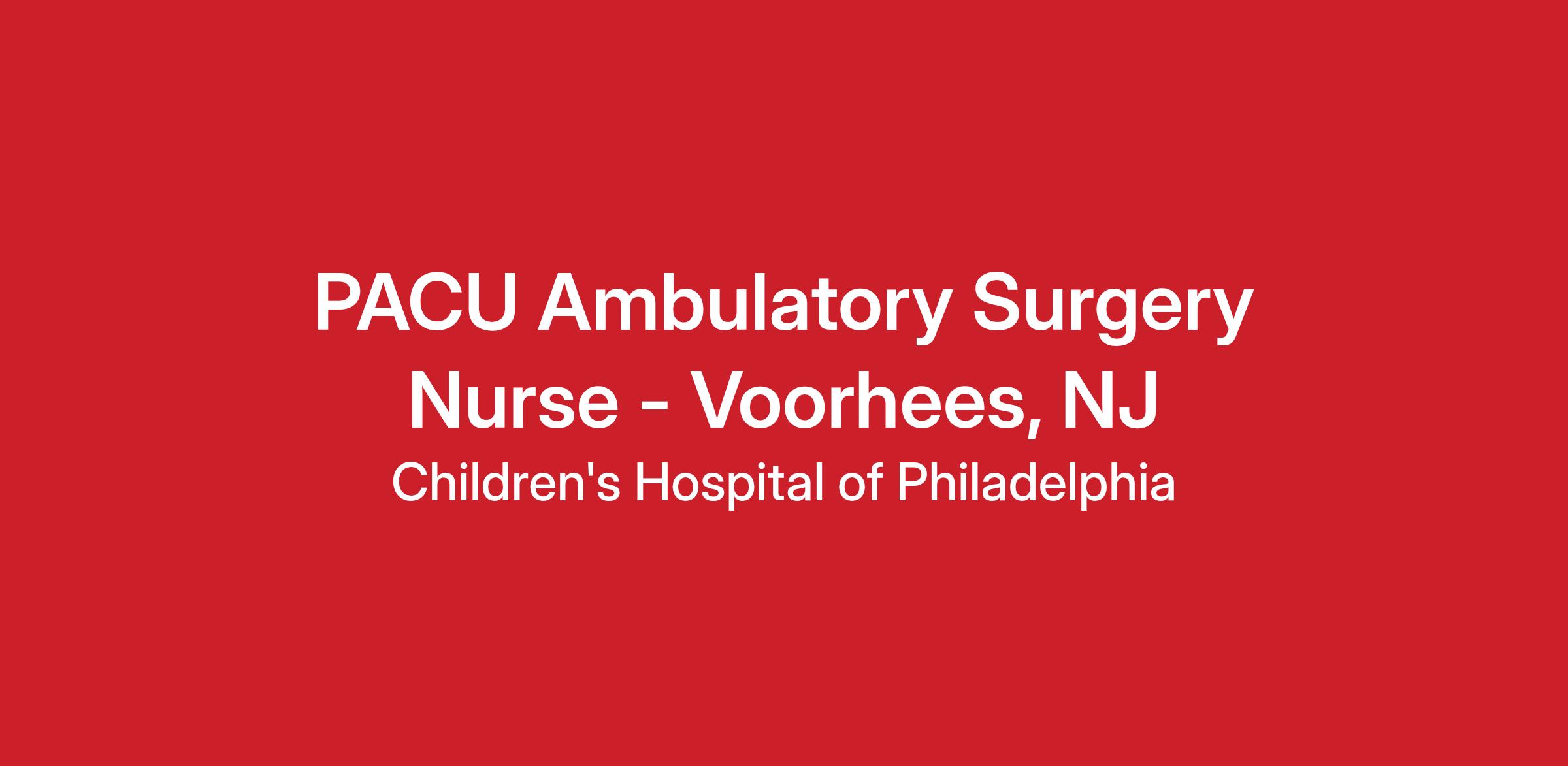 This is a great Full-Time opportunity to support our Voorhees NJ Ambulatory Surgery Center. Ideal candidate must have pediatric PACU, ED or critical care experience. NJ Nursing Licensure or Compact licensure required upon hire.