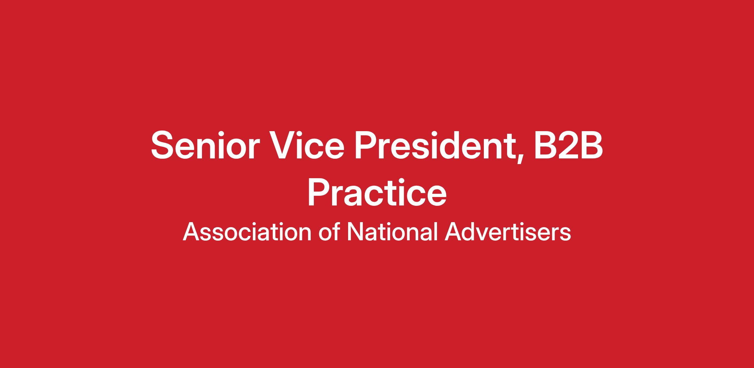 Position Summary The Senior Vice President of the ANA B2B Marketing Practice is the organization’s leading voice for modern B2B marketing. This executive sets the strategic direction for the Practice, elevates ANA as the industry’s premier authority, and convenes the world’s most senior B2B marketing leaders to shape the future of the discipline. The SVP will drive industry‑defining thought leadership, oversee a $1M+ portfolio of programs and events, and ensures B2B’s role as a commercial growth engine is fully recognized across the ANA ecosystem.