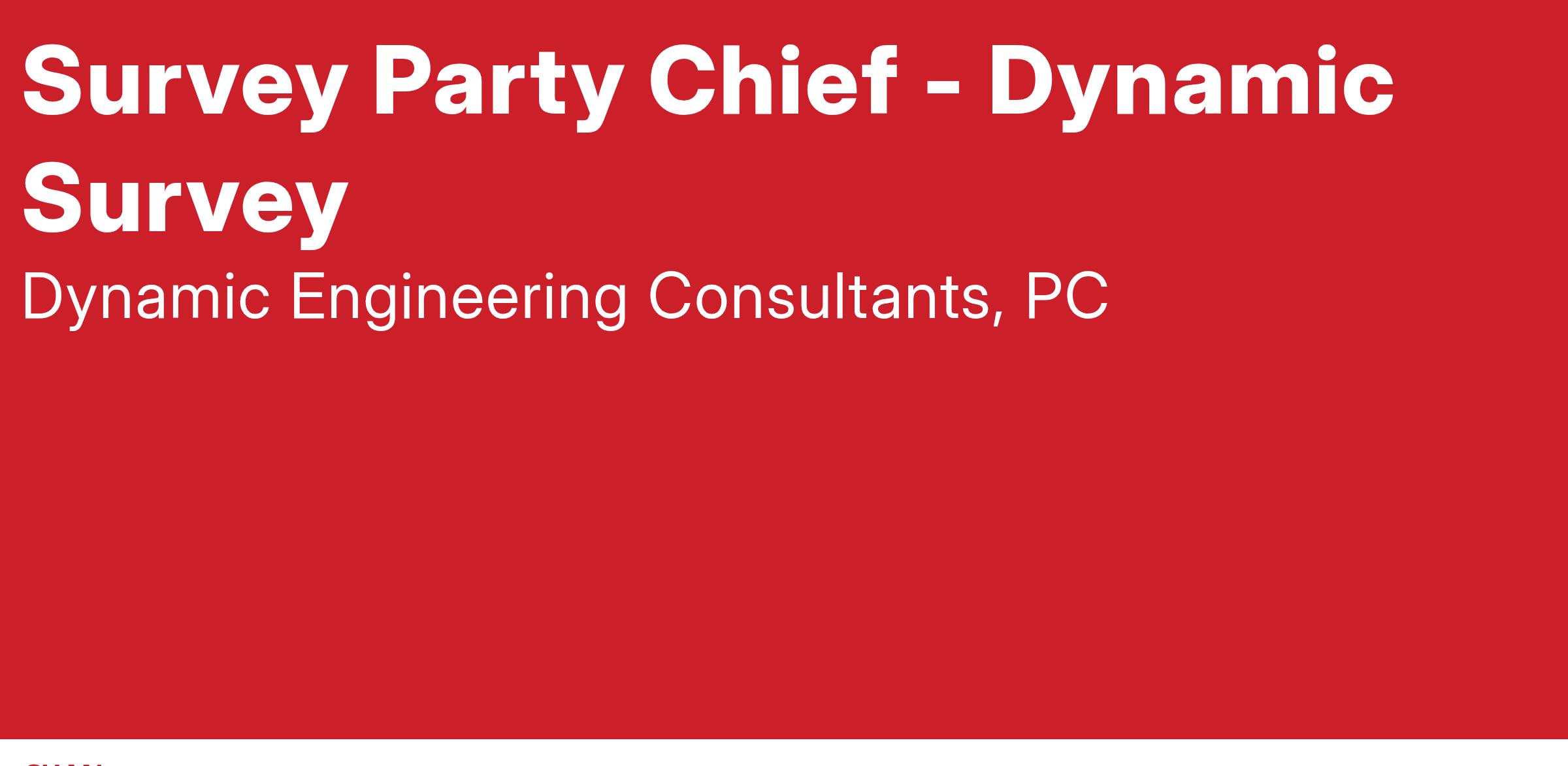 Dynamic Survey, a division of Dynamic Engineering Consultants is seeking a motivated, team-oriented individual with field survey knowledge and experience for small and large scale commercial, residential and industrial projects. The Party Chief is responsible for surveying to determine precise location and measurements of points, elevations and contours for construction, subdivisions, titles, or other land development purposes. Duties include all aspects of surveying including but not limited to: boundary, location, topographic, title and ALTA surveys, calculations, deed research, field data analysis, aerial ground control and topographic surveys, utility locations including pipe inverts and sizes, Right-of-Way Surveys, Wetland Location Surveys, and construction layout.