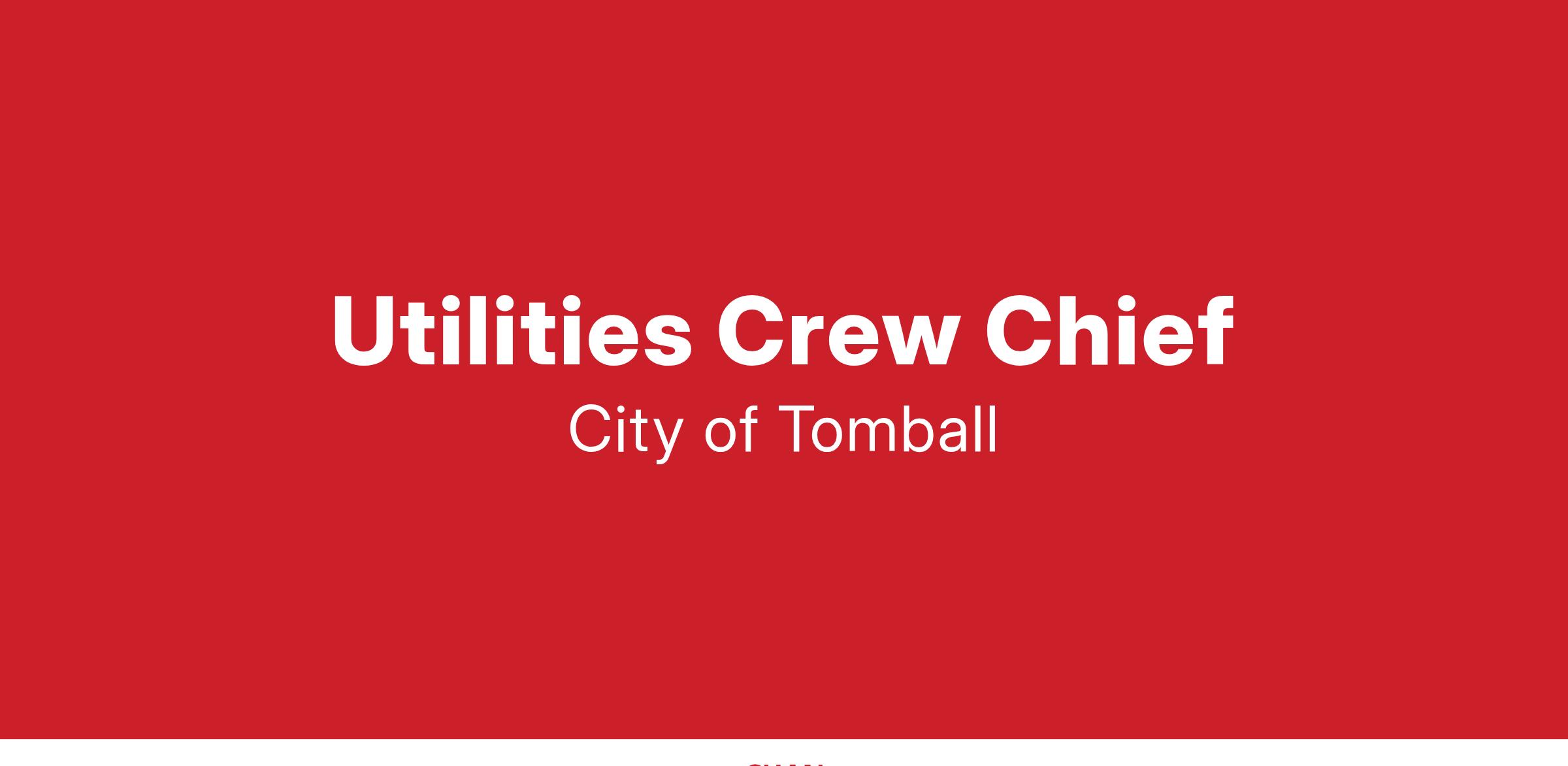 The City of Tomball is accepting applications for the position of Utilities Crew Chief. This position will supervise over a utility crew, guiding them in the installation, construction, repair, and maintenance of the City-owned water, sewer, and gas utility facilities. As an experienced professional, the Crew Chief is entrusted with critical decision-making responsibilities, emphasizing job safety, efficient task completion and work order and records reporting.